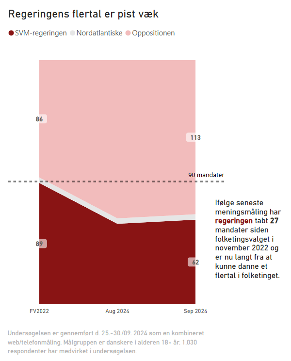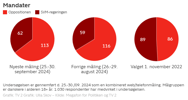 Det andet eksempel på visualisering af udviklingen i blokkenes størrelse er fra artiklen Moderaterne får vælgerlussing, viser ny måling fra september 2024 på tv2.dk og benytter sig af en blanding af ovenstående.